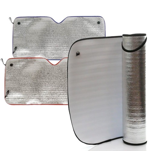 Parasol en aluminio a una cara en color plateado de acabado metalizado con ribetes de poliéster en vivos colores. De tamaño 130x60cm y espuma en el reverso. Cintas elásticas de ajuste con argollas metálicas de refuerzo, dos ventosas para ajuste en luna y presentación desplegado en plancha para fácil impresión.