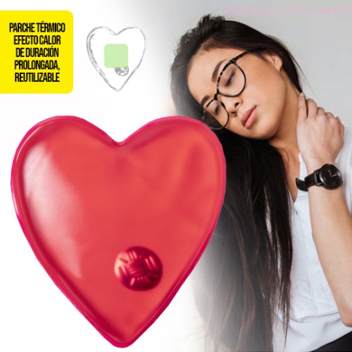 Parche térmico con diseño corazón. Reutilizable y con efecto calor de duración prolongada. Se activa doblando la chapa metálica para que el parche se endurezca y se caliente. Para reutilizar, se calienta agua en un recipiente con el parche dentro hasta que el gel interior vuelva a su estado líquido, presionando la chapa metálica de nuevo. Disponible manual de instrucciones en español e inglés. Reutilizable