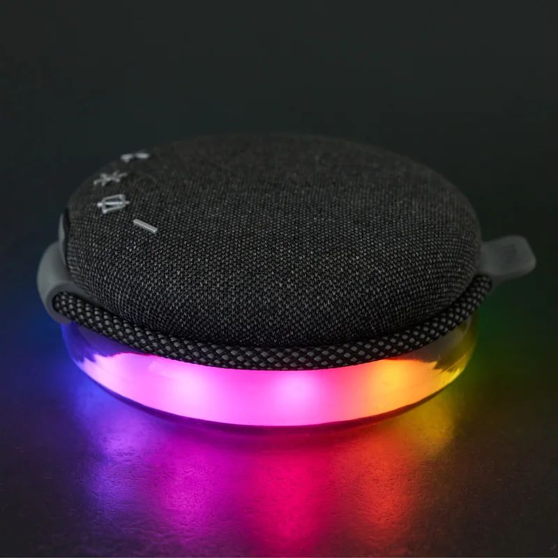 El parlante Fullmoon cuenta con luces led multicolor y una correa ajustable para que lo lleves a donde quieras. Está fabricado en ABS y silicona, con un recubrimiento de tela.