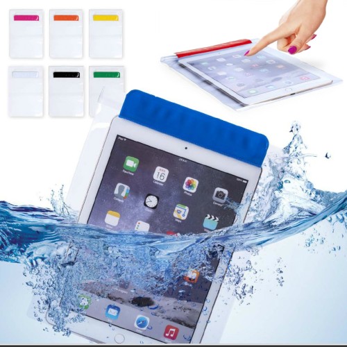 Práctico portatodo impermeable en PVC con función táctil, diseñado especialmente para tablets de hasta 9,7 pulgadas y doble sistema de seguridad para preservar la estanqueidad. Con solapa frontal en variada gama de colores. Impermeable. Pantalla Táctil