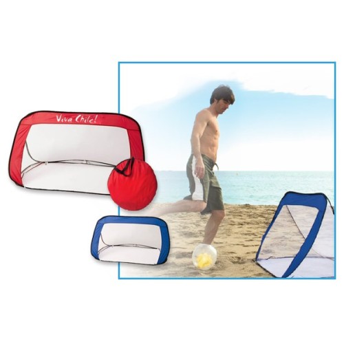 Divertida portería plegable de vivos colores en combinación de resistente nylon y tejido de redecilla. Con cómoda bolsa de transporte con asas. Plegable. Funda Poliéster