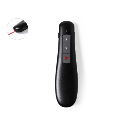 Puntero láser inalámbrico para presentaciones. De diseño ergonómico, incluye accesorio plugplay para conectarlo al puerto USB del ordenador, sin necesidad de instalar software adicional para su correcto funcionamiento. Compatible con multitud de sistemas operativos (Windows, OS X, Linux y Android). Con botones avance/ pausa/ retroceso/volumen y alimentación a pilas: 2xAAA incluidas. Presentado en elegante y resistente estuche de cartón negro, con funda e interior troquelado en espuma. Manual de instrucciones en español e inglés. Inalámbrico. Conexión USB. 2 Pilas AAA/ R03 Incluidas