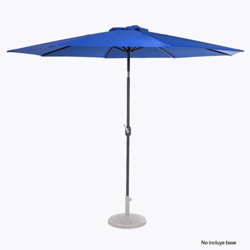 Quitasol redondo de Ø3m, modelo "Shake", con 8 cascos de lona Poliéster UV impermeable de 160g. Contiene varas reforzadas de Acero recubierto de 12 x 18mm, asta de Acero recubierto de 38mm, sistema de apertura automático con manivela y codo giratorio de 45°. No incluye base.