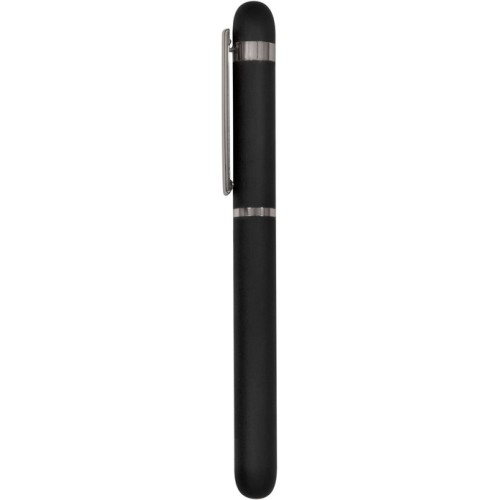 Metal. Cuerpo de aluminio. Roller. Apertura con tapa a presión. Clip y anillos metálicos color plata. Tinta Negra. Destape electroplateado en ambas partes. Presentación en estuche con cierre magnético.