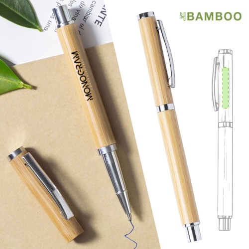 Roller de capucha de línea nature. Fabricado en bambú, con cuerpo de suave acabado y accesorios cromados. De cartucho jumbo, con tinta azul. Carga Jumbo