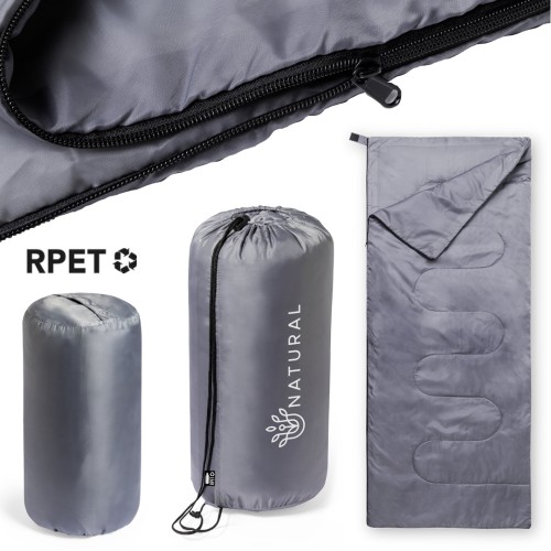 Saco de dormir fabricado en resistente poliéster RPET 190T de agradable y cálido tacto, en color gris. Con grueso acolchado interior y cierre de cremallera de apertura total con doble tirador interior y exterior. Funda a juego en RPET, con cierre de cordón, ajustador y etiqueta exterior con distintivo RPET. El material RPET se elabora a partir de plástico reciclado, para así fomentar la reutilización de residuos plásticos y ayudar a la sostenibilidad del planeta. Funda Poliéster RPET