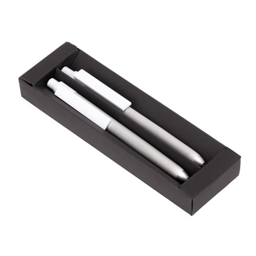 ANAPOIMA reúne lo esencial del diseño ejecutivo con una mirada comprometida con el planeta. Este set incluye bolígrafo y portaminas fabricados en aluminio reciclado, con cuerpo plateado y detalles en fibra de trigo que aportan un contraste natural. Empacado en una caja negra elegante, ANAPOIMA es una excelente alternativa para transmitir sofisticación sin exceso, y ligereza sin descuido ambiental. Tu marca cobrará fuerza al asociarse con herramientas que reflejan precisión, estilo y responsabilidad en cada detalle.