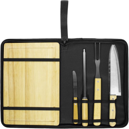 23 x 35,5 x 4,2 cm. Poliéster 300D, bambú y acero inoxidable. Set de asado de 5 piezas: Tabla de bambú 32,5 x 21,5 x 1,1 cm. Tenedor asador, cuchilla, cuchillo y chaira para afilar, todos con mango de madera barnizados. Presentación en caja de regalo.