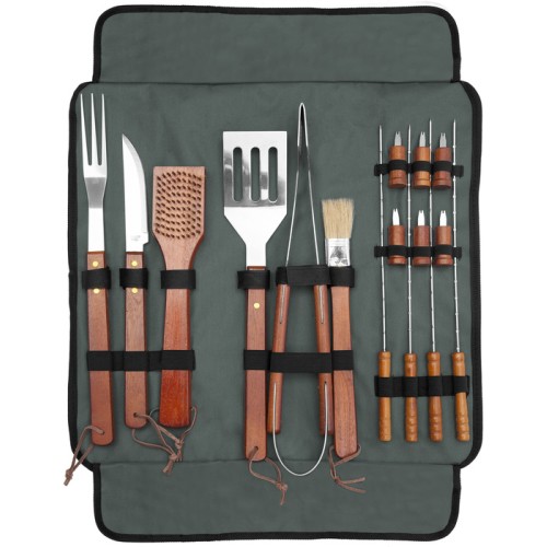Ø 9 x 46 cm. (cerrado) 60 x 46 cm. (abierto). Poliester y acero inoxidable. Set para asador cuenta con tenedor asador, cuchilla de acero inoxidable, cepillo de aluminio, espátula, pinza, pincel, 4 pinchos para brochetas y 6 pinchos pequeños. Estuche de polyester con manilla y tres hebillas plásticas para cerrar.