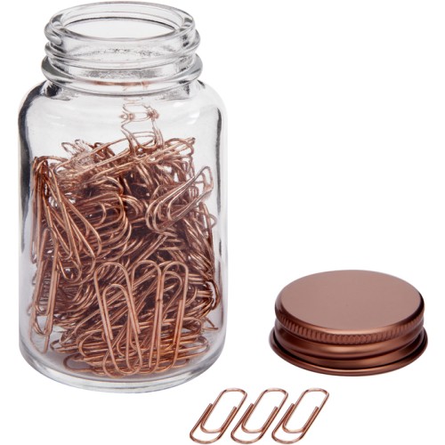 Ø 4,5 x 8,5 cm. Vidrio y metal. Set de clips metálicos en frasco de vidrio con tapa metálica.