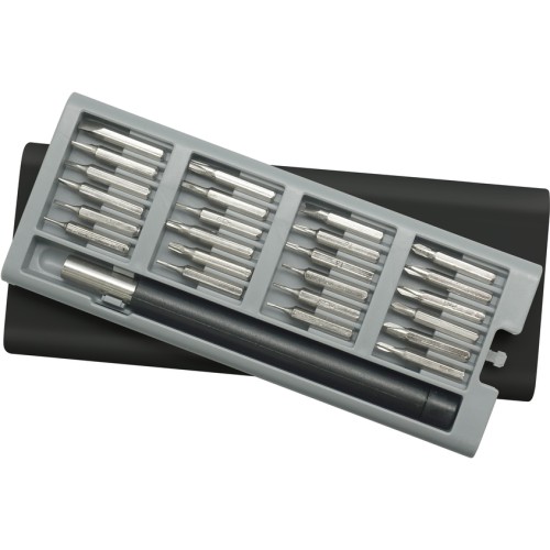 16,5 x 6,8 x 1,8 cm. Plástico y Acero. Mango con punta imantada con 24 puntas diferentes. La caja viene con cuatro compartimentos imantados que permiten mantener ordenadas las diferentes puntas. La caja contiene apertura push.