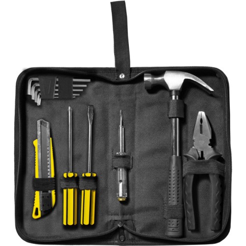 27 x 14 x 4,5 cm. (cerrado) /27 x 32,2 x 4,5 cm. (abierto) Poliéster 600D Oxford. Set de herramientas en estuche con cierre y creamallera. Contiene 11 piezas, todas sujetadas con elastico anti deslizante: Cuter, pinza alicate, martillo, 2 destornilladores de diferentes puntas (punta plana y punta phillps), un destornillador tester y 5 llaves allen. Presentación en caja de regalo.