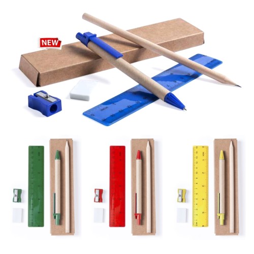 Set de 5 piezas en variada gama de vivos colores presentadas en estuche de cartón natural. Incluye bolígrafo de mecanismo pulsador y tinta azul en cartón reciclado, lápiz de cuerpo cilíndrico en madera, sacapuntas, goma y regla de 15cm. 5 Piezas