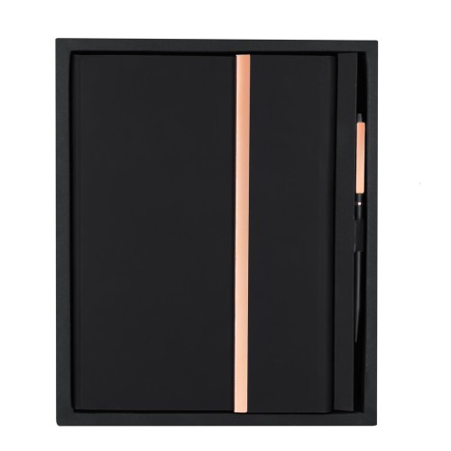 Set de bloc de notas y bolígrafo fabricados en PU Reciclado y Aluminio Reciclado. En elegante negro mate y con distinguidos accesorios en acabado oro rosa. El set incluye: Bloc de notas fabricado en PU Reciclada y elegante detalle en oro rosado, con tapas rígidas y sistema de cierre imantado. Incluye 80 páginas de color crema con líneas, un marcapáginas a juego y soporte para bolígrafo. Con distintivo PU Reciclada. Bolígrafo de aluminio reciclado, con cuerpo en color negro mate y detalles en acabado oro rosa. Dispone de clip metálico, mecanismo giratorio y tinta azul. Incluye distintivo de aluminio reciclado. Todo el conjunto se presenta en un elegante estuche negro. La PU Reciclada destaca por su resistencia y elasticidad. Este material reciclado y reciclable es una opción sostenible que rescata las fibras desechadas en los procesos de fabricación, minimizando así el desperdicio de material y contribuyendo a su vez a reducir el impacto ambiental, manteniendo a la vez sus propiedades originales.El Aluminio Reciclado es un material con posibilidades de reciclaje casi infinitas, sin perder sus propiedades originales y consumiendo menos energía en este proceso.Certificación GRS (Global Recycled Standard / Estándar de Reciclaje Global), que garantiza el origen reciclado del material usado para fabricar el producto. Bloc PU Reciclada. Portada Rígida. 80 Hojas. Bolígrafo Aluminio Reciclado Incluido