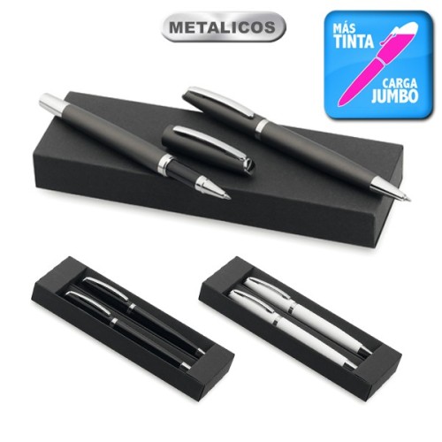 Elegante set de bolígrafo de mecanismo giratorio y roller de capucha en sobrio diseño. De cuerpo de aluminio en suave acabado con accesorios en colores plateados. Presentado en estuche individual de cartón con funda en color negro. Bolígrafo con cartucho jumbo. En tinta azul. Bolígrafo y Roller. Carga Jumbo