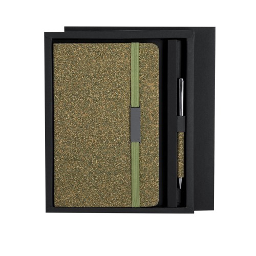 Set de bloc de notas y bolígrafo confeccionados con Fibra de Té. Incluye un bloc de notas de tapas rígidas, con 80 páginas rayas, banda elástica con clip metálico y marcapáginas a juego. Además, cuenta con un bolígrafo de aluminio de acabado cromado con empuñadura de Fibra de Té, mecanismo giratorio y tinta azul. Con logo Tea Grounds marcado en la parte trasera del bloc de notas. Se presenta de manera elegante en una caja negra.Tea Grounds es un material sostenible creado a partir de residuos de hojas de té recicladas. Durante el procesamiento del té, se recolectan y compactan los restos para darles una segunda vida como recurso útil. Su producción fomenta la economía circular y reduce el impacto ambiental. Bloc Portada Rígida. 80 Hojas. Bolígrafo Incluido