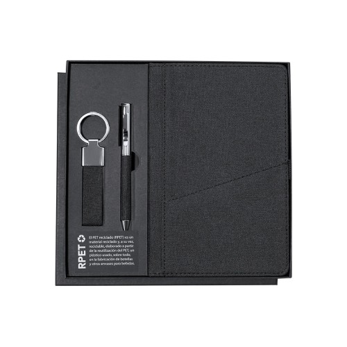 Elegante set premium que incluye:Bloc de notas en RPET en elegante color negro. Incluye cierre elástico, bolsillo frontal y marcapáginas de tela. Interior con 80 hojas de disposición a una raya. Bolígrafo en RPET de acabado negro mate, de mecanismo giratorio y tinta azul. Con clip y puntera en pulido metal.Elegante llavero con cinta fabricada en poliéster RPET 300D y accesorios cromados.Set presentado en estuche individual de acabado mate, con troquelado interior para cada uno de los elementos del set y tarjeta de RPET en el interior.El material RPET se elabora a partir de plástico reciclado, para así fomentar la reutilización de residuos plásticos y ayudar a la sostenibilidad del planeta. Bloc Portada Rígida. 80 Hojas. Bolígrafo. Llavero