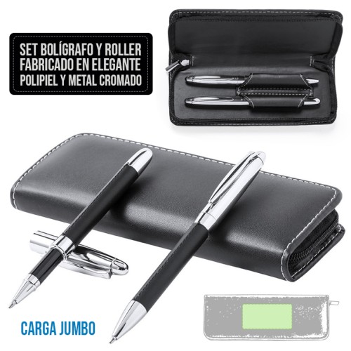 Set premium de bolígrafo y roller. Fabricado en elegante combinación de polipiel en tonos negros y metal cromado. Bolígrafo de mecanismo giratorio en tinta azul y con cartucho jumbo. Roller con capucha y tinta gel en azul, carga jumbo. Presentado en estuche individual de polipiel con cierre de cremallera e interior a juego con compartimentos individuales. Bolígrafo y Roller. Carga Jumbo