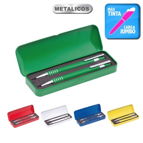 Set de bolígrafo de mecanismo pulsador y portaminas en original diseño bicolor. De cuerpo metálico en suave acabado de vivos colores y accesorios en colores plateados. Con empuñadura anillada y presentado en resistente estuche individual metálico a juego con suave espuma troquelada. Bolígrafo de cartucho jumbo con tinta azul y portaminas con minas de 0,7mm incluidas. Bolígrafo Carga Jumbo. Portaminas: Minas 0,7 mm Incluidas