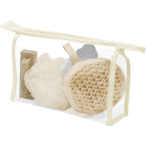 18,5 x 12 x 5 cm. Plástico. Set con 2 esponjas una es exfoliante, piedra/lima y cepillo para uñas.