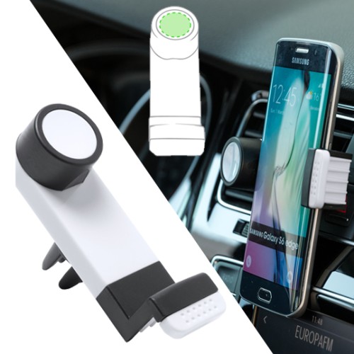 Soporte para smartphone de diseño minimalista y elegante acabado bicolor en blanco y negro. Con sistema de fijación para rejilla de ventilación del automóvil y pastilla circular frontal especialmente diseñada para marcaje en tampografía. Ajustable