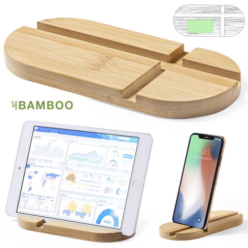 Original y sencillo soporte de línea nature para smartphone y tablet. Fabricado en bambú procedente de cortes naturales. Presentado en atractiva caja individual de diseño eco.