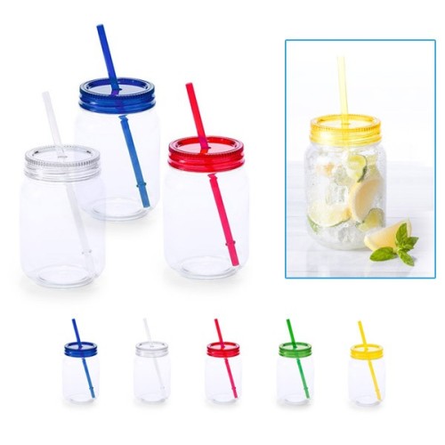 Divertido tarro de PS de 600ml de capacidad con cuerpo en transparente y accesorios en variada gama de vivos colores. Con tapa a rosca y pajita a juego. 600 ml