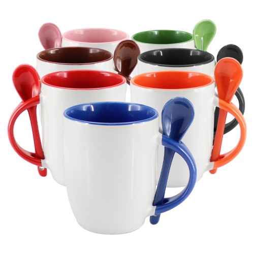 Tazón Cerámico blanco con interior, asa y cuchara de color, cobertura exterior con polímero especial marca ORCA COATINGS(R) para una sublimación de primera calidad. Cada unidad se entrega dentro de su caja individual de cartón blanco.