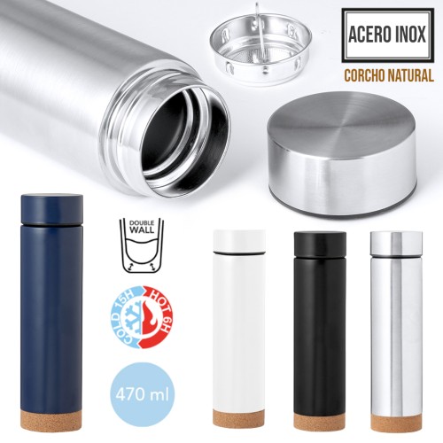 Termo en acero inox de 470 ml de capacidad con base de corcho. Con doble pared para mejor y más duradera conservación de la temperatura. Infusor incluido y sistema de apertura fácil a rosca. Disponible en variada gama de colores y presentado en atractiva caja de diseño kraft. Elaborado con elementos vegetales para así fomentar la utilización de materias primas naturales y reducir las emisiones contaminantes. 470 ml. Infusor Incluido