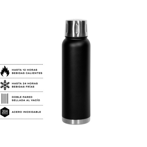 Ø 8,4 x 30 cm. Capacidad 1000 ml. Acero inoxidable. Termo Doble pared con recubrimiento de cobre. Interior en acero 304 y exterior en acero 201. Pintura Powder Coat (pintura mas duradera y resistente a la corrosión y el paso del tiempo). Tapa de acero a rosca. Tapón con apertura y cierre a presión. Mantiene por más de 12 hs la temperatura de las bebidas calientes y 24 hs de las bebidas frías. Presentación en caja de regalo.