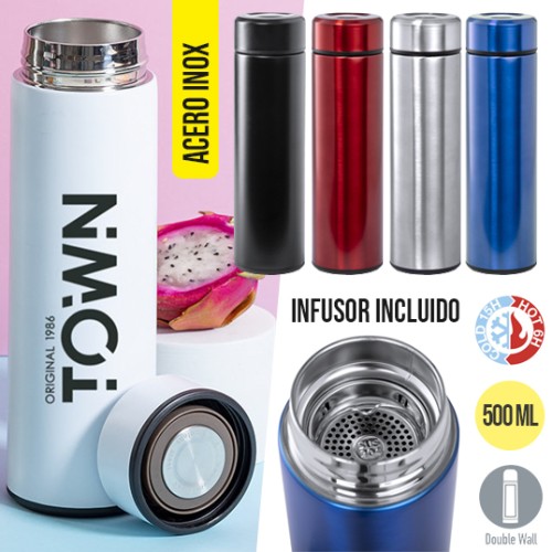 Termo en acero inox de 500ml de capacidad. Con doble pared para mejor y más duradera conservación de la temperatura. Infusor incluido y sistema de apertura fácil a rosca. Disponible en variada gama de colores y presentado en atractiva caja de diseño. 500 ml. Infusor Incluido