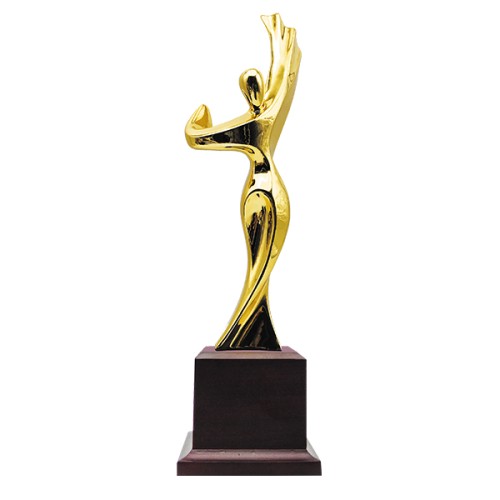Trofeo de Resina con figura de victoria pintado de color oro. Incluye base de madera. Presentación en estuche azul con interior de terciopelo.