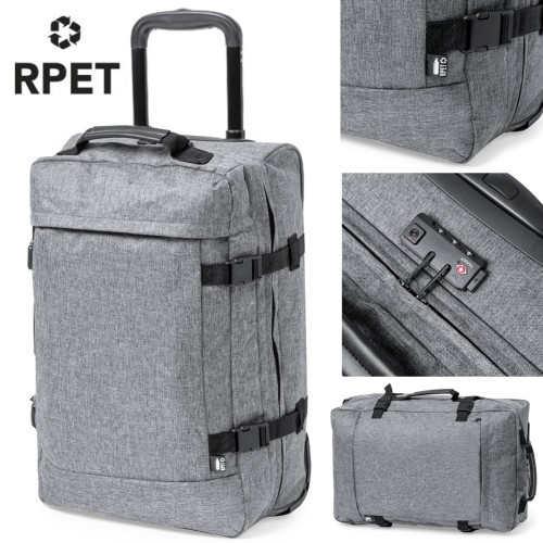 Trolley de línea nature fabricado en resistente 300D RPET. Compartimento principal con cierre de cremallera de doble tirador conforme a los estándares TSA -Administración de la Seguridad en el Transporte-, que permite a las autoridades de aduanas inspeccionar el contenido del equipaje sin tener que forzar o romper el cierre, usando una llave especial a disposición de la autoridad. Interior forrado y con cintas elásticas de sujeción. Exterior con 2 cintas ajustables, cierres de hebilla, bolsillo frontal con cierre de cremallera invisible y 2 asas acolchadas de transporte. Mecanismo extensible metálico en negro, con cómoda asa de transporte y 2 ruedas. Distintivo RPET en etiqueta exterior. Cierre Seguridad TSA