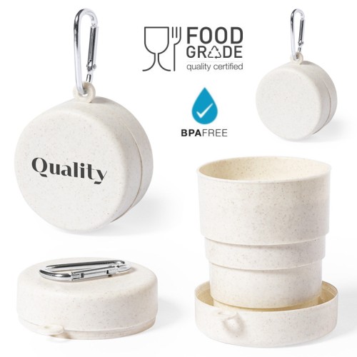 Original vaso plegable para emergencias fabricado en PP veteado libre de BPA. De 220ml de capacidad, con mosquetón metálico de transporte. Certificación Food Grade, garantizando la seguridad cuando los alimentos entran en contacto con el material usado para fabricar el producto. 220 ml