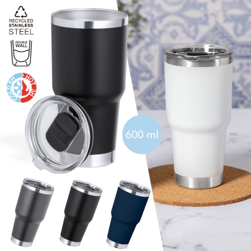 Vaso térmico de Acero Inox Reciclado de doble pared y 590 ml de capacidad. Con dosificador en tapa, libre de BPA, y disponible en variada gama de colores. Con logotipo Acero Inox Reciclado. Presentado en caja individual de diseño kraft. El acero es uno de los materiales más demandados y que puede encontrarse casi en todas partes, desde productos de uso diario a grandes construcciones. Con innumerables propiedades, entre las que cabe destacar la durabilidad y su alto grado de reutilización, convirtiéndolo en una alternativa muy valorada en soluciones de sostenibilidad. Debidamente tratado, permite obtener nuevos recursos de infinita utilización. 600 ml